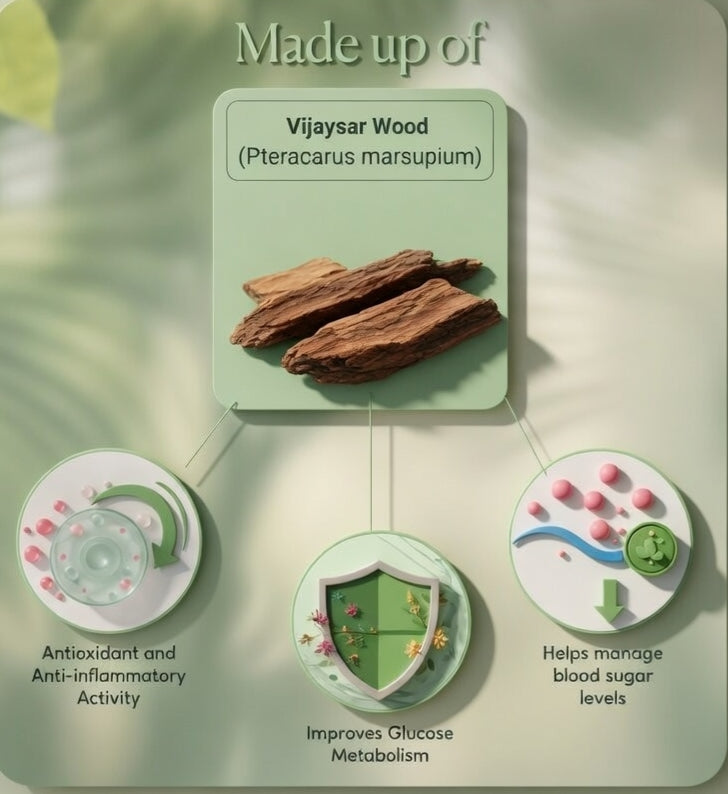 - Made from pure Indian Vijaysar (Pterocarpus Marsupium), known in Ayurveda for metabolic wellness.